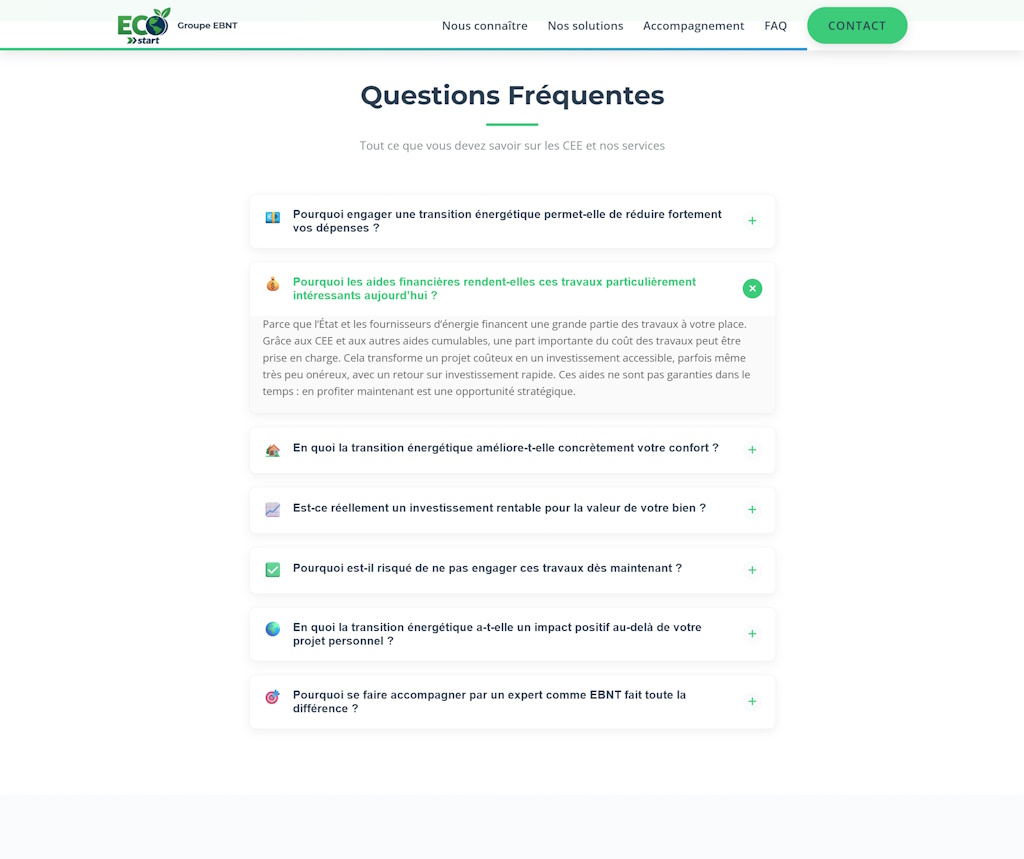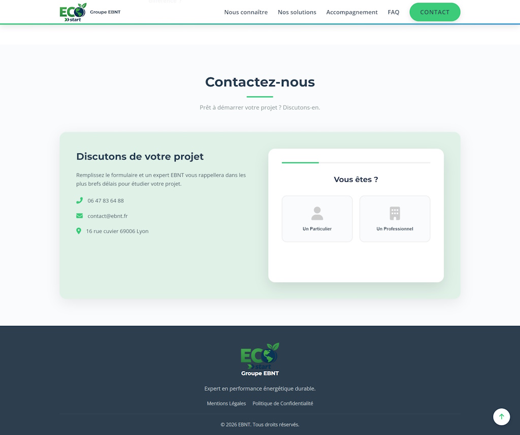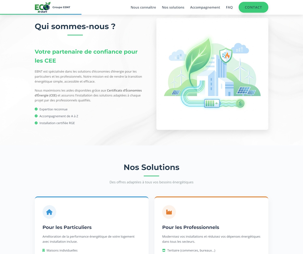 בפרויקט זה יצרתי עבור EBNT נוכחות דיגיטלית מדויקת שמטרתה להגדיל פניות איכותיות בשוק ה-B2C האנרגטי בצרפת. EBNT פועלת בתחום המעבר האנרגטי וחיסכון באנרגיה, ומסייעת ללקוחות למקסם הטבות באמצעות מנגנון CEE (Certificats d’Économies d’Énergie) לצד ליווי והתקנה על ידי בעלי מקצוע מוסמכים.
